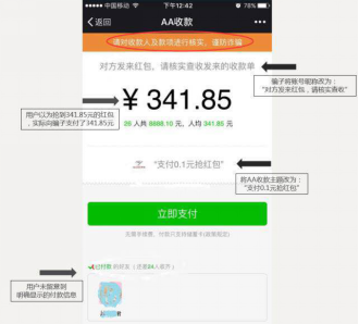 ??近期一種“付0.1元搶紅包”的騙局正在盛行。騙子將AA收款頁面文字偽裝成紅包頁面,以“支付0。1元”的噱頭引導網友上當,實質上,網友的支付是AA收款的金額。